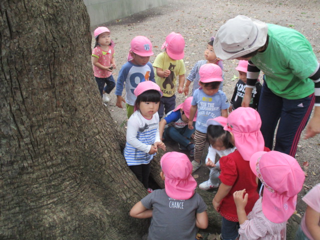 「かくれんぼしよう。」と何人かで遊ぶチーム。どんぐり拾いをしたことを覚えていて、どんぐり拾いや、きれいな落ち葉を探しを楽しむチームなど、それぞれ時間いっぱいまで遊びました。