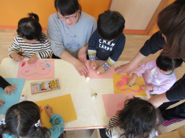 今回はおだんごパスや、クレヨンで蝶々🦋の絵に模様を描いてもらいました。派手になぐり書きをする子、丁寧に塗り潰す子、グルグルと楽しく描いて満足する子、様々な蝶々が出来ました(o^^o)