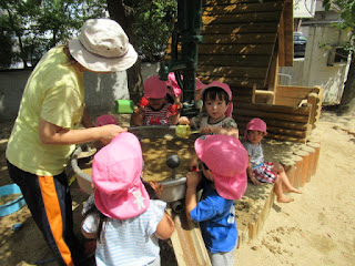 まだまだ暑さも残る日々で園庭に出た途端お水をリクエストされたのでタライに水を入れて遊びました。