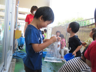今年はプールには入れませんが水遊びで大胆に遊ぼう!と手作り水遊び遊具を沢山出して、思いっきりビショビショになって遊びました!